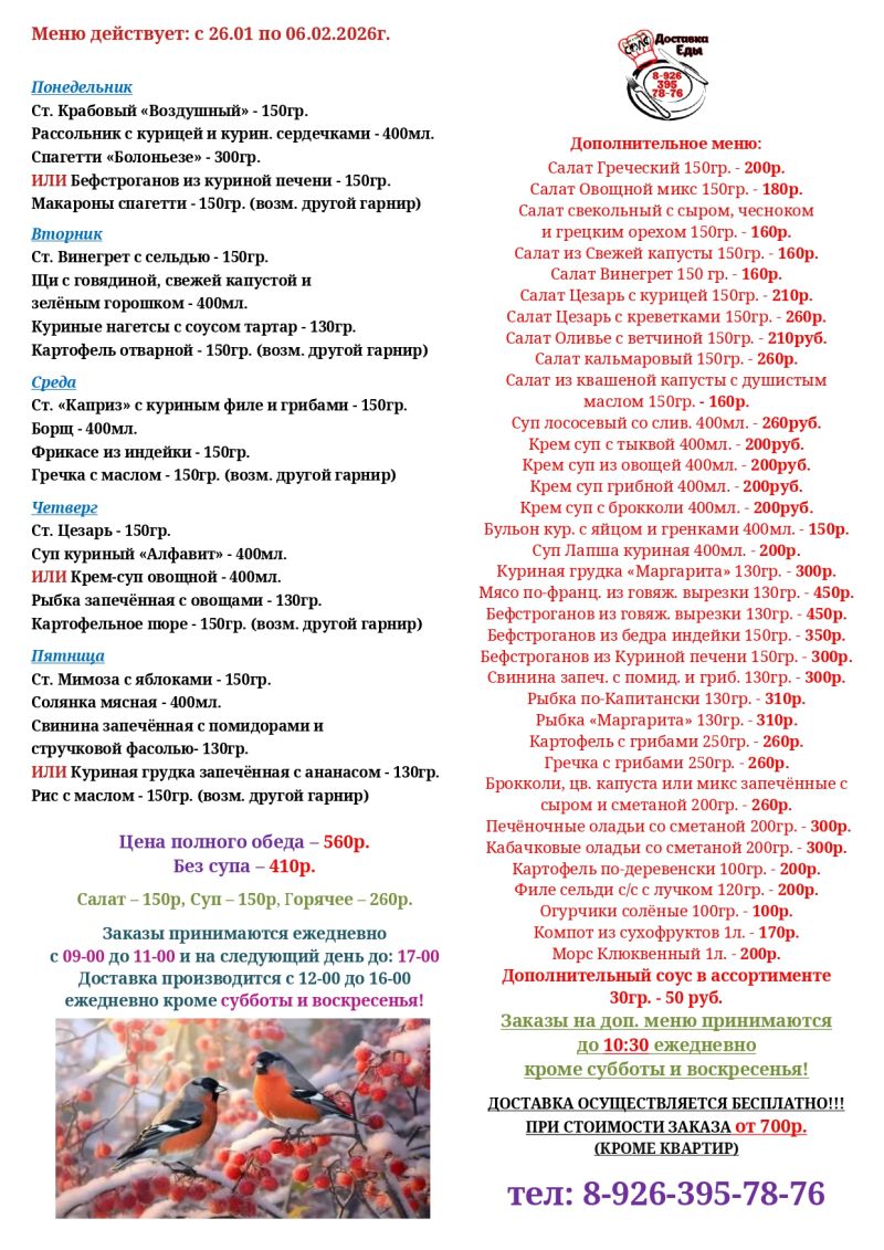 МЕНЮ ДЕЙСТВУЕТ С 26.01.26 ПО 06.02.2026Г.